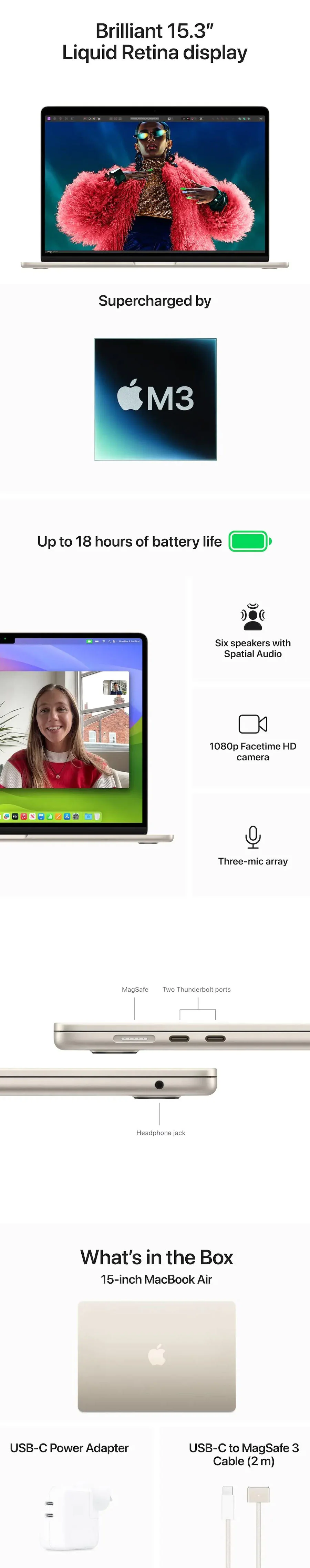 | What's In The Box: | MacBook Air, 35W Dual USB-C Port Compact Power Adapter, USB-C to MagSafe 3 Cable (2m) |