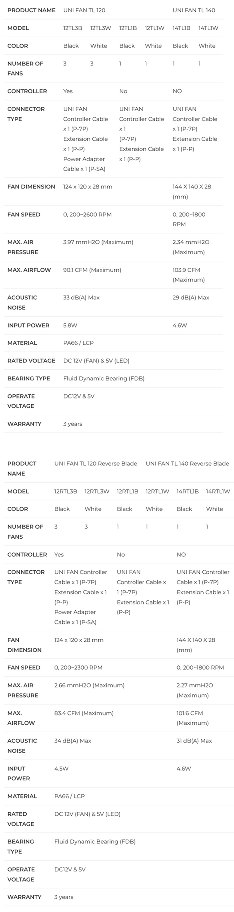 Elevate the PC setup with UNI FAN TL black and white fans, available in 120mm and 140mm sizes with normal and reverse blades.